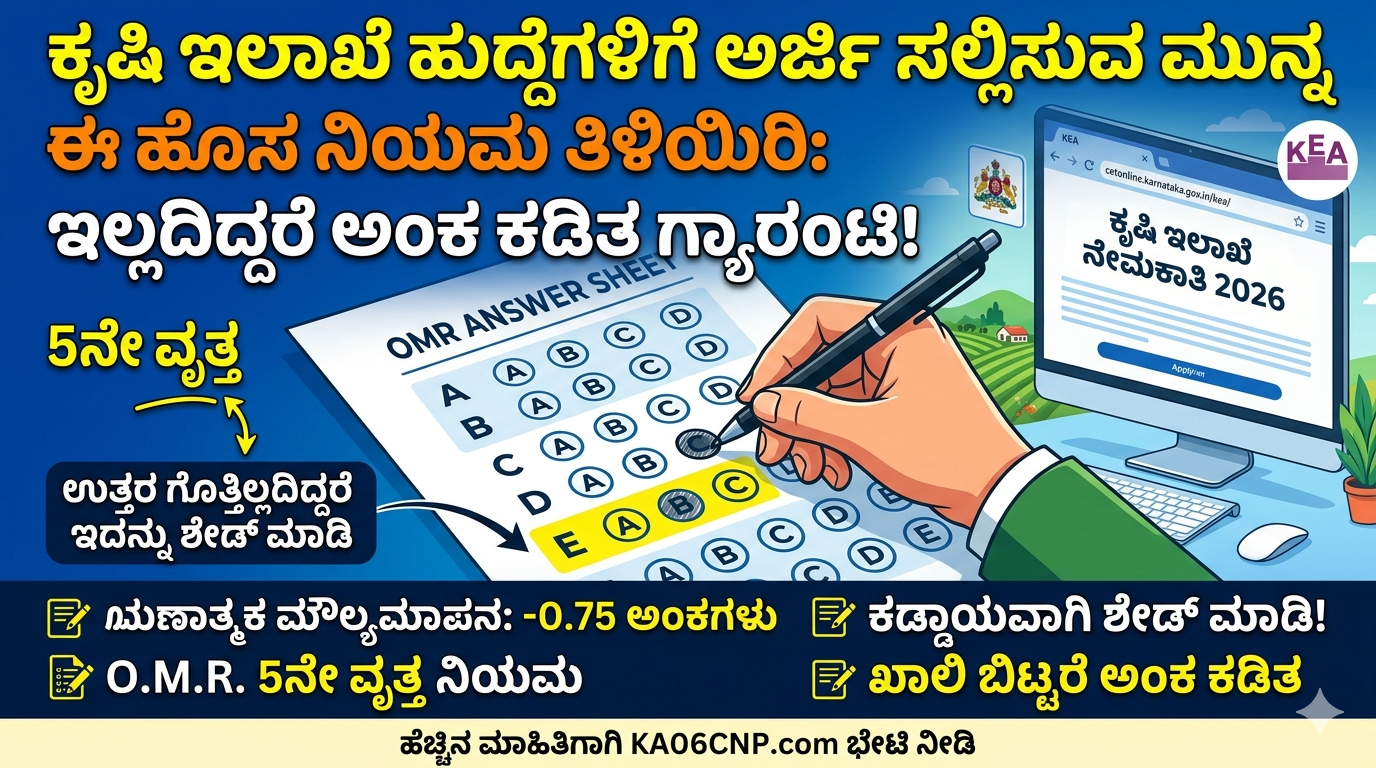 ಕರ್ನಾಟಕ ಸರ್ಕಾರದ ಕೃಷಿ ಇಲಾಖೆಯಲ್ಲಿ ವೃತ್ತಿಜೀವನವನ್ನು ರೂಪಿಸಿಕೊಳ್ಳಲು ಬಯಸುವ ಅಭ್ಯರ್ಥಿಗಳಿಗೆ ಸುವರ್ಣಾವಕಾಶ ಒದಗಿ ಬಂದಿದೆ. ಕರ್ನಾಟಕ ಪರೀಕ್ಷಾ ಪ್ರಾಧಿಕಾರವು (KEA) 2026ನೇ ಸಾಲಿನ ಕೃಷಿ ಅಧಿಕಾರಿ (Agriculture Officer – AO) ಮತ್ತು ಸಹಾಯಕ ಕೃಷಿ ಅಧಿಕಾರಿ (Assistant Agriculture Officer – AAO) ಹುದ್ದೆಗಳ ಭರ್ತಿಗೆ ಬೃಹತ್ ಅಧಿಸೂಚನೆಯನ್ನು ಪ್ರಕಟಿಸಿದೆ. ಈ ಲೇಖನದಲ್ಲಿ ನಾವು ಈ ನೇಮಕಾತಿಯ ಪ್ರತಿಯೊಂದು ಹಂತ, ಹೊಸ ಪರೀಕ್ಷಾ ನಿಯಮಗಳು, ಅರ್ಜಿ ಸಲ್ಲಿಸುವ ವಿಧಾನ ಮತ್ತು ಪರೀಕ್ಷಾ ತಯಾರಿ ಬಗ್ಗೆ ಸಂಪೂರ್ಣವಾಗಿ ಚರ್ಚಿಸೋಣ.