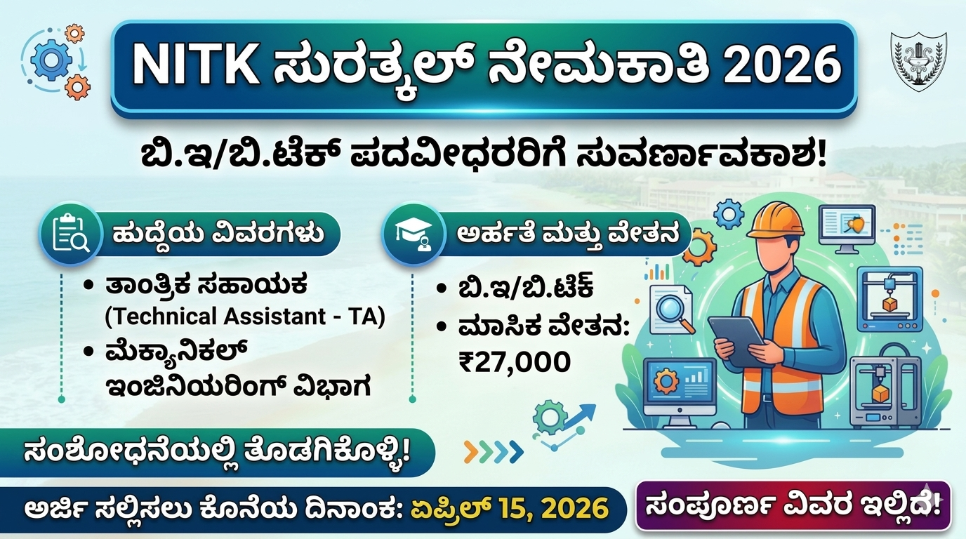 NITK Surathkal Recruitment 2026: ಕರ್ನಾಟಕದ ಕರಾವಳಿ ತೀರದ ಹೆಮ್ಮೆಯ ಶಿಕ್ಷಣ ಸಂಸ್ಥೆ, ನ್ಯಾಷನಲ್ ಇನ್ಸ್ಟಿಟ್ಯೂಟ್ ಆಫ್ ಟೆಕ್ನಾಲಜಿ ಕರ್ನಾಟಕ (NITK), ಸುರತ್ಕಲ್ ಈಗ ಉದ್ಯೋಗಾಕಾಂಕ್ಷಿಗಳಿಗೆ ಹೊಸದೊಂದು ಅವಕಾಶವನ್ನು ನೀಡಿದೆ. ವಿಶೇಷವಾಗಿ ಇಂಜಿನಿಯರಿಂಗ್ ಪದವೀಧರರು ಮತ್ತು ಸಂಶೋಧನೆಯಲ್ಲಿ ಆಸಕ್ತಿ ಇರುವವರಿಗೆ ಇದು ಅತ್ಯುತ್ತಮ ವೇದಿಕೆಯಾಗಿದೆ. 2026ರ ಸಾಲಿನ ಈ ನೇಮಕಾತಿ ಅಧಿಸೂಚನೆಯಲ್ಲಿ ‘ತಾಂತ್ರಿಕ ಸಹಾಯಕ’ (Technical Assistant) ಹುದ್ದೆಗೆ ಅರ್ಜಿ ಆಹ್ವಾನಿಸಲಾಗಿದೆ.