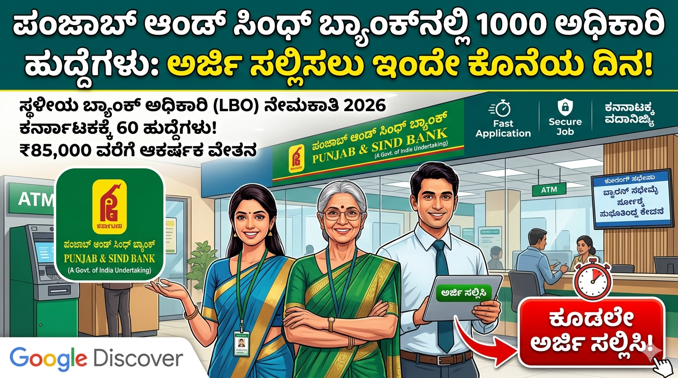 - Punjab and Sind Bank Recruitment 2026 : 1000 ಬ್ಯಾಂಕ್ ಅಧಿಕಾರಿ ಹುದ್ದೆಗಳಿಗೆ ಅರ್ಜಿ ಆಹ್ವಾನ; ಕನ್ನಡಿಗರಿಗೆ ₹85,000 ವರೆಗೆ ವೇತನ!
